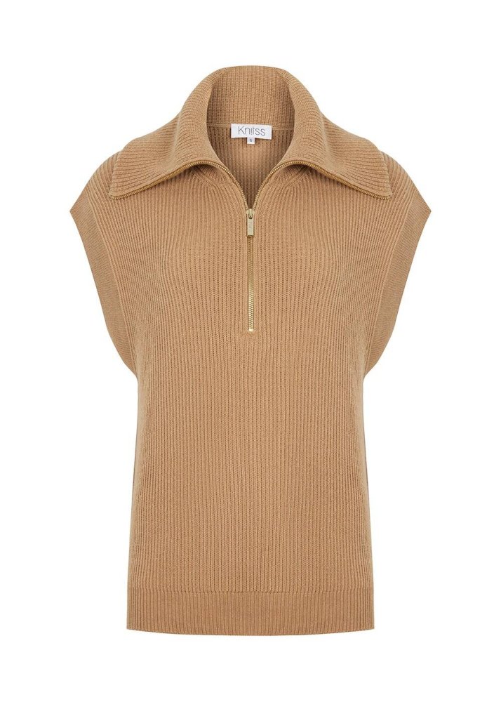 Fermuarlı oversize camel triko yelek, çağdaş stili ile özgün bir giyim zevkine hitap eder. Geniş yakalı kolsuz fermuarlı camel triko yelek, spor-şık kombinlerinize zahmetsiz şıklığı Knitss farkı ile getirir. Kaşmir ve yün gibi geri dönüştürülmüş sertifikalı İtalyan elyaflarından üretilen camel triko yelek, doğaya saygılı bir modacılık anlayışının şık bir üyesidir.