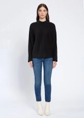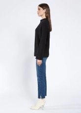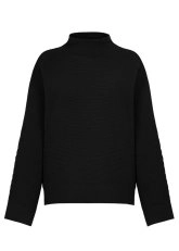 Oversize siyah kazak, kaşmirli yün içeriği ve çağdaş stili ile Knitss kalitesini kışlık kombinlerinize taşır. Geri dönüştürülmüş sertifikalı kaşmirli yün iplik içeriği ile sürdürülebilir modanın şık bir temsilcisi olan siyah bol kesim dik yaka kazak, trikoya özgü kendinden çizgili zarif örgü deseni ile de fark yaratır.