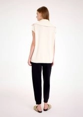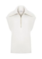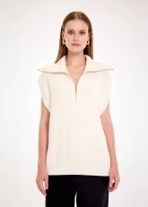 Geniş yakalı fermuarlı oversize triko yelek, çağdaş stili ile konforundan ödün vermeden tarz giyinen Knitss kadınlarından ilhamla üretildi. Geri dönüştürülmüş sertifikalı İtalyan ipliklerinden üretilen triko yelek, sürdürülebilir elyaf yapısı ile çevre dostudur. Spor-şık kombinlerinize zahmetsizce uyum sağlayacak kolsuz ekru triko yelek, stil sahibi ve kullanışlı bir parçadır.