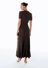 Koyu kahverengi triko etek, özel örgü dokusuyla klasik parçaları farklı bir boyuta taşıyor. A-kesim tasarımı hareket özgürlüğü sunarken, akıcı formu sayesinde zahmetsiz bir şıklık sağlıyor. İtalyan iplik kalitesinin getirdiği konforla günün her anında rahatça kullanabileceğiniz bu parça, hem zarif topuklularla hem de modern sneaker’larla kombinlenebilir. Kahverenginin sıcak ve derin tonu, doğallığıyla öne çıkarken aynı zamanda cool bir şehir şıklığı yaratıyor.