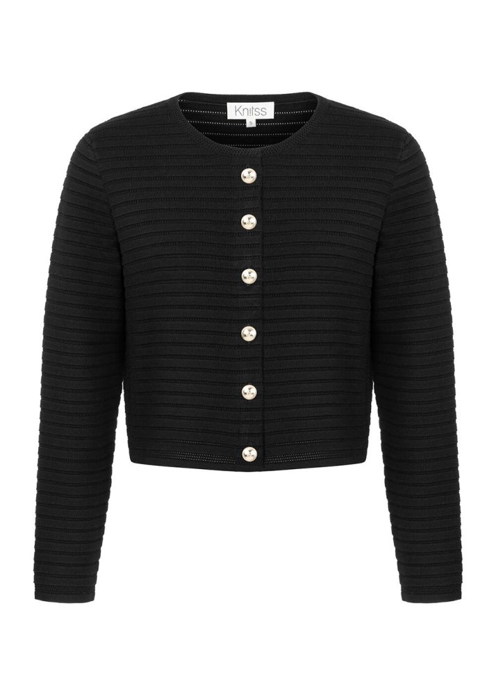 Özgün ruhunu ayrıcalıklı parçalarla stiline yansıtmayı seven Knitss kadınları için üretilen siyah triko ceketi keşfedin. İtalyan ipliklerinden üretilen mücevher düğmeli ince triko ceket, özel örgü detaylı tasarımı ve çağdaş stili ile dikkat çeker. Takımı olan triko pantolonla birlikte kusursuz şıklıkta ofis/davet kombini sunarken tek başına da birçok parça ile zahmetsizce eşleşebilecek kullanışlı bir parçadır.