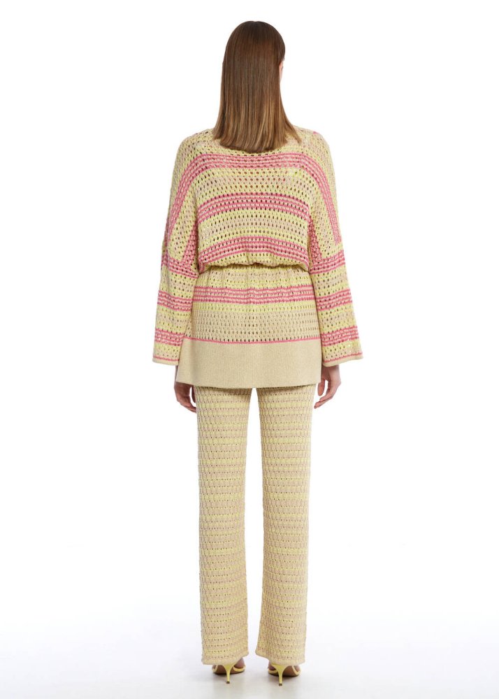 Bir Knitss klasiği olan triko kimono, pembe-sarı ve krem çizgili bu şık modeli ile yeni sezonda da yazlık kombinlere ayrıcalık katıyor. Sürdürülebilir pamuk ve viskon ipliklerinden üretilen beli bağcıklı delikli çizgili kimono, triko örgünün kendine has şıklığını konforla tamamlıyor. Plajda, evde, ofiste, birçok farklı ortama zahmetsizce uyum sağlayacak triko kimono ile giyiminize taze bir dokunuş katın.