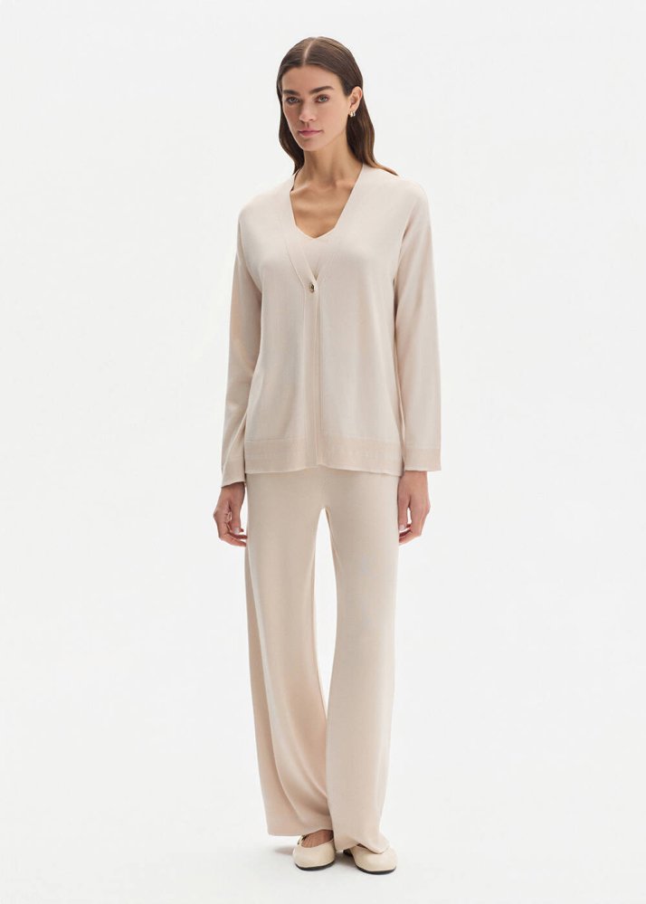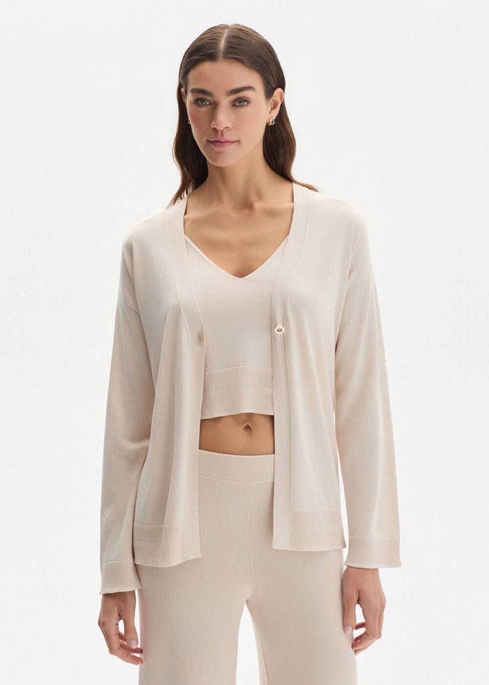 Pamuk ve ipek karışımı dokusuyla hafif, yumuşak ve akışkan bir his sunan naturel triko hırka, rahat kesimi ve düşük omuz formuyla modern bir siluet oluşturur. Tek düğme kapamalı tasarımı sade bir zarafet sağlarken, doğal tonu kombinlere dingin ve zamansız bir görünüm kazandırır. Günlük stil için konforlu ve rafine bir tamamlayıcıdır.