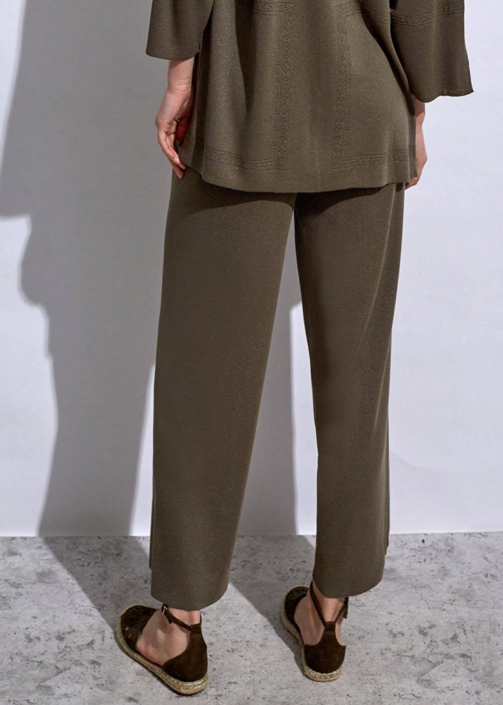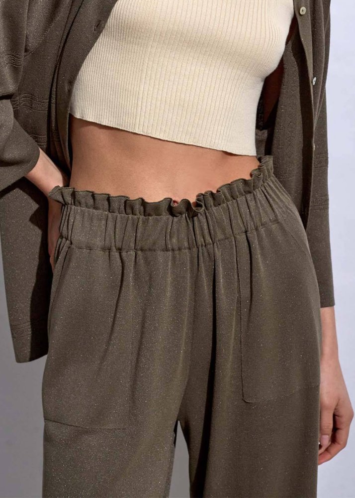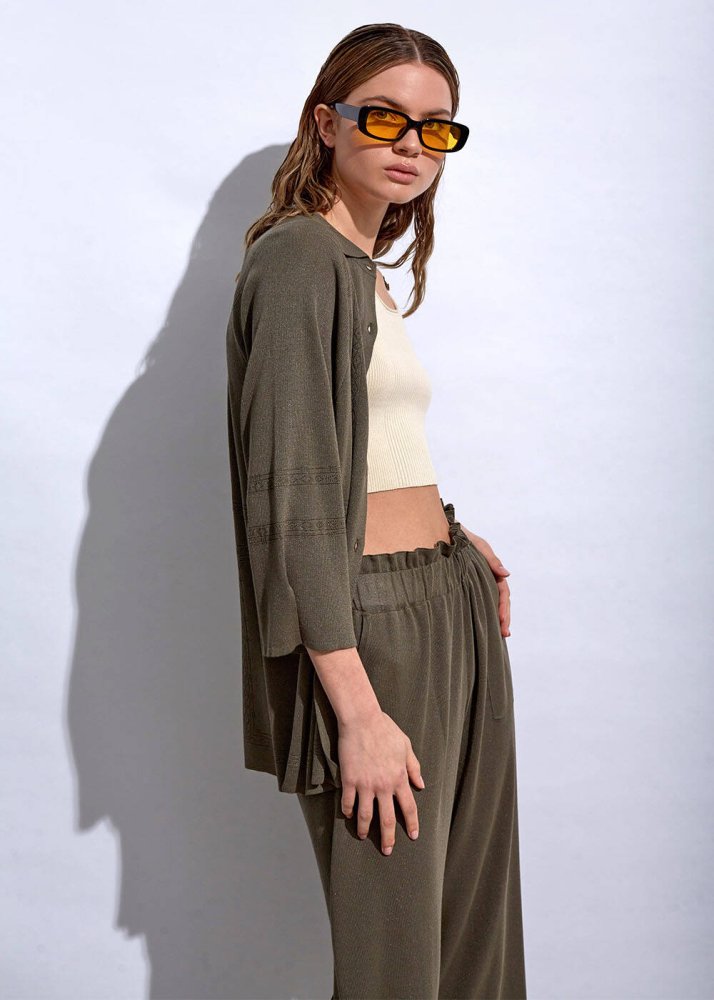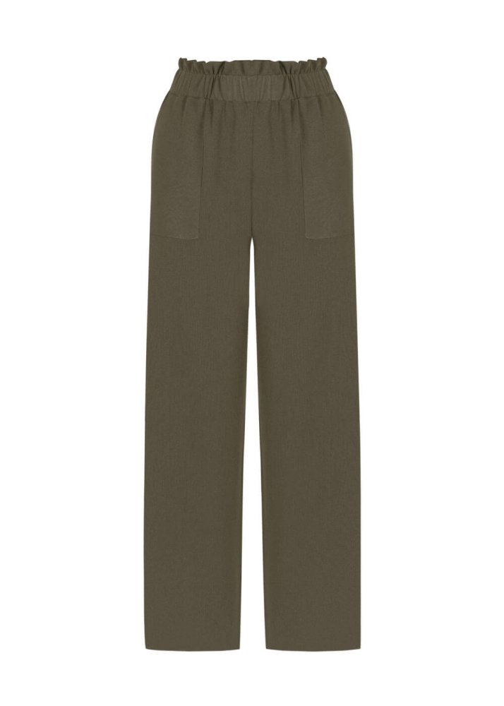 FSC sertifikalı İtalyan viskon iplik kalitesi ve çağdaş tasarımı ile dolabınıza değer katacak triko pantolon, sezonun trendi haki rengi, cep ve belden büzgülü detayları ile şıklık ve konforu bir arada sunar. Yüksek bel triko pantolon modeli, smart casual ve günlük kombinlerinize kolaylıkla uyum sağlar.