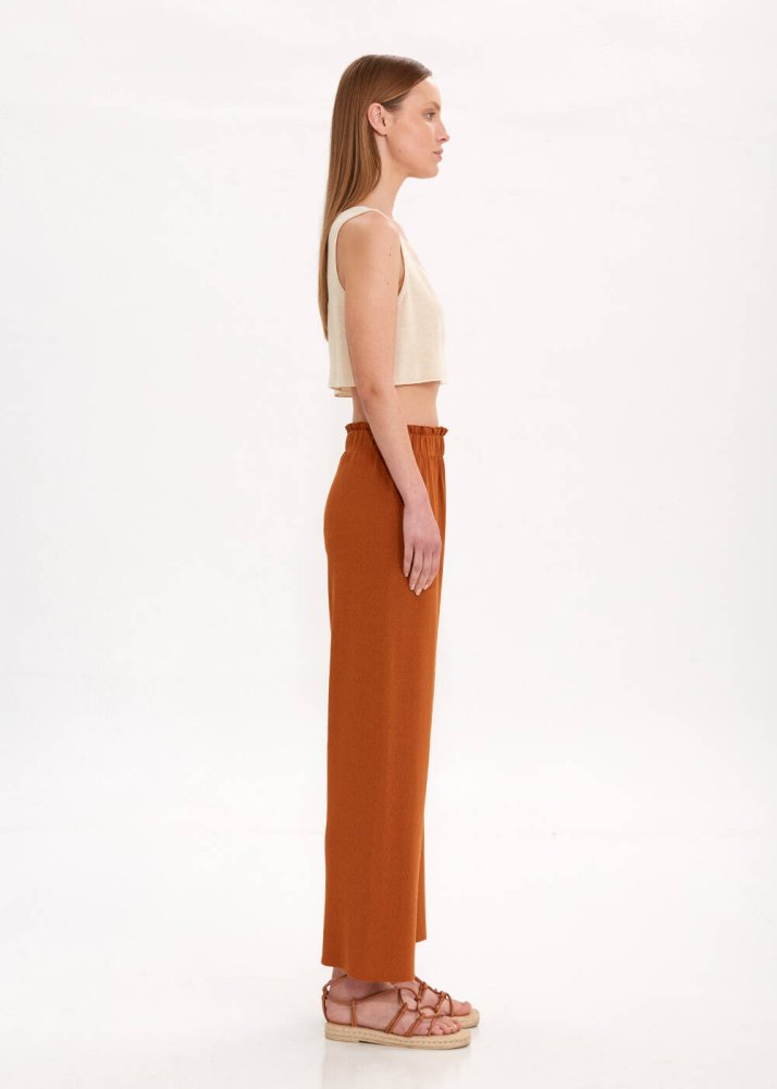 Tarçın rengi triko pantolon, FSC sertifikalı İtalyan iplik kalitesi ile çevre dostu giyim ürünü olarak tasarlanmıştır. Belden büzgü detayına sahip triko pantolon modeli, rahat kesim kalıbı ve cep detaylarıyla konforlu bir yaz stili sunar. Business ve günlük stilinize uygun kadın triko pantolon modelini, koleksiyonda yer alan triko üstlerle kolaylıkla kombinleyebilirsiniz.