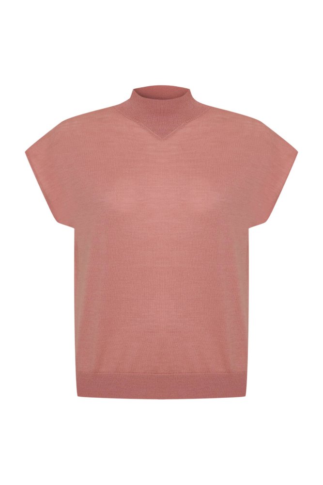 Yumuşak pembesiyle feminen bir dokunuş sunan bu triko üst, %75 Merino yün ve %25 Lenzing Lyosel karışımıyla hem sıcak hem nefes alabilir bir his sağlıyor. Dik yaka ve kolsuz tasarımı, farklı parçalarla katmanlı kombinler oluşturmayı kolaylaştırıyor. Triko pantolon, etek veya ceketlerle bir araya geldiğinde hem zarif hem hareketli bir stil sunuyor. Yumuşak ve hafif yapısı, gün boyu konfor sağlayan, birçok mevsimde tercih edilebilecek bir parça.
