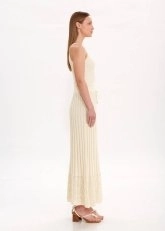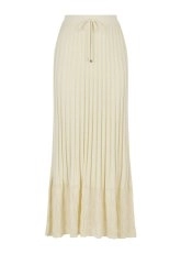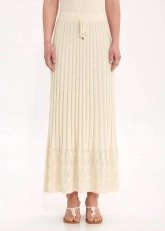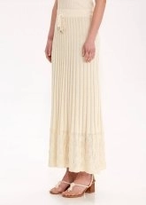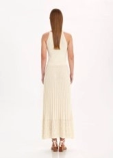 Feminen zarafeti mistik bohem ruhuyla buluşturan bej rengi pileli uzun triko etek, sofistike giyim zevkine sahip kadınlar için üretildi. Pointel detaylı etek ucu ve pileli tasarımıyla triko şıklığını günlük, ofis ve gece kombinlerine zahmetsizce taşıyan bej etek, sürdürülebilir İtalyan pamuk ve viskon ipliklerinden üretildi. Konfordan ödün vermeden doğal şıklığı zarif detaylarla tamamlayan triko etekle her ortamda özel hissedin.