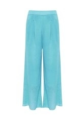 Capcanlı mavi rengi ile doğaya uyumlu, dinamik bir yazlık giyim stili sunan triko pantolon, pile detayı ve desenli geniş paça modeli ile fark yaratır. Konforundan ödün vermeden çarpıcı detaylarla stilini özgünleştirmeyi bilen Knitss kadınları için üretilen mavi triko pantolon, geri dönüştürülmüş İtalyan iplik içeriği ve özgün tasarımı ile yazlık kadın kombinlerine ayrıcalık katar.
