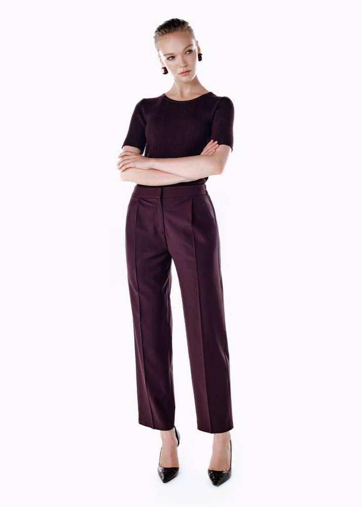 Mürdüm tonunun asil etkisini taşıyan pile detaylı yün pantolon, klasik stilin modern yorumu olarak öne çıkıyor. Pileli yapısı feminen bir akış kazandırırken, elastik arka beli maksimum rahatlık sunar. Yün dokusunun sıcaklığıyla poliamid ve elastanın esnekliği birleşerek kusursuz bir denge yaratır. Yan ve arka cepler, pratikliği zarafetle bütünleştirir. Aynı ton triko üstlerle kombinlendiğinde etkileyici bir görünüm oluşturur.