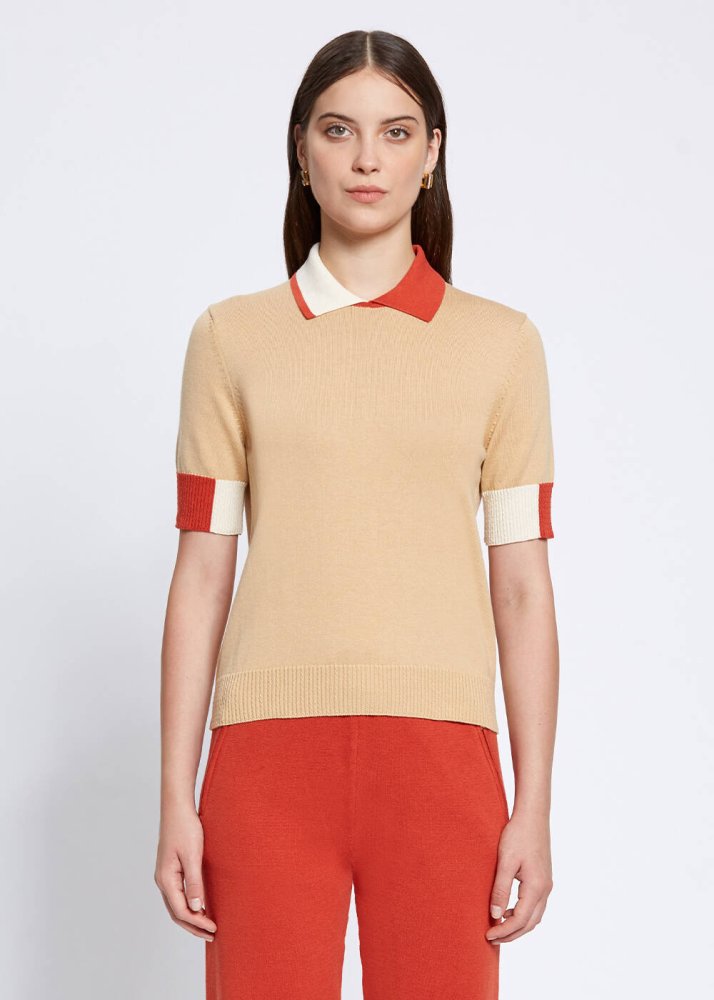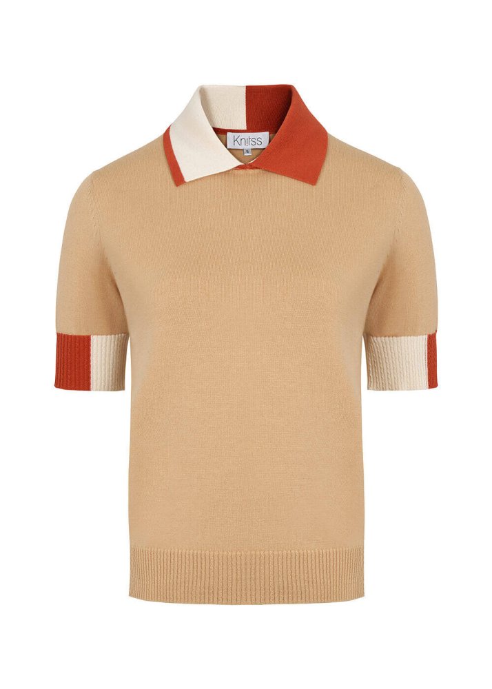 Polo Neck Contrast Detailed Camel Knit Top
