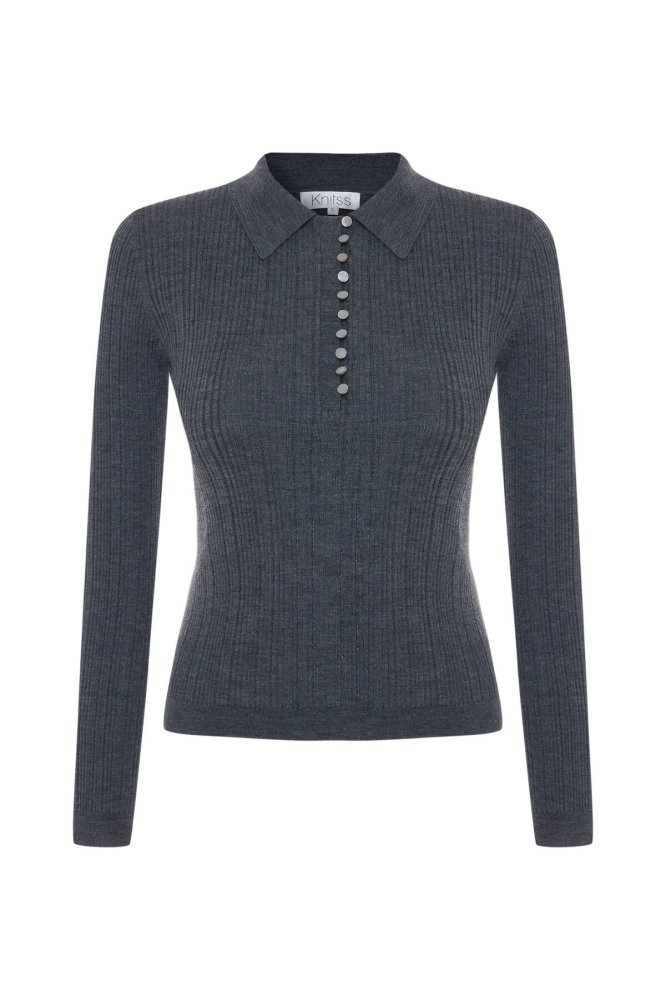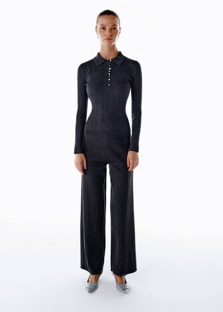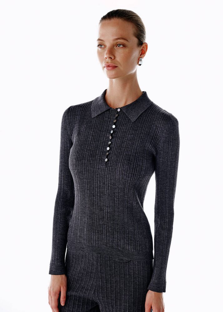 POLO NECK MERINO WOOL RICH BLEND KNIT TOP DARK GREY