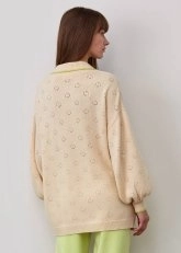 Polo Yaka Ajur Örgü Krem Rengi Yün Karışımlı Kazak
