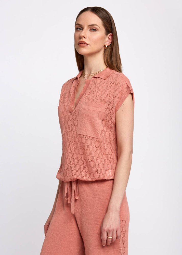 Polo yaka triko üst, rose rengi ile yaz kombinleriniz için mükemmel bir kombin tamamlayıcısı olacak. Keten karışımlı triko üst, nefes alan soğuk dokusu ile konforlu bir giyim deneyimi sağlar. Cep ve belden bağcık detayına sahip kadın triko üst, takımı olan Elisa Pants ile şık sportif bir stil sunar. Koleksiyonun diğer parçaları ile kolaylıkla kombinleyebileceğiniz polo yaka triko üst, business ve sportif kombinleriniz için idealdir.
