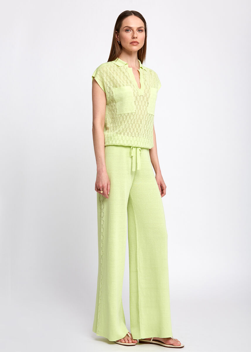 Yeşil triko üst, içerdiği keten karışımı ile soğuk ve nefes alan bir yapıya sahip olması sayesinde terletme yapmaz. Sportif ve günlük kombinlerinize şıklık katacak triko üst, koleksiyonun diğer parçaları ile kolaylıkla kombinleyebilirsiniz. Takımı olan Elisa Pants ile mükemmel bir uyum içerisinde olan polo yaka triko üst modeli, belden bağcık ve büzgü detayı ile fonksiyonel ceplere sahiptir.