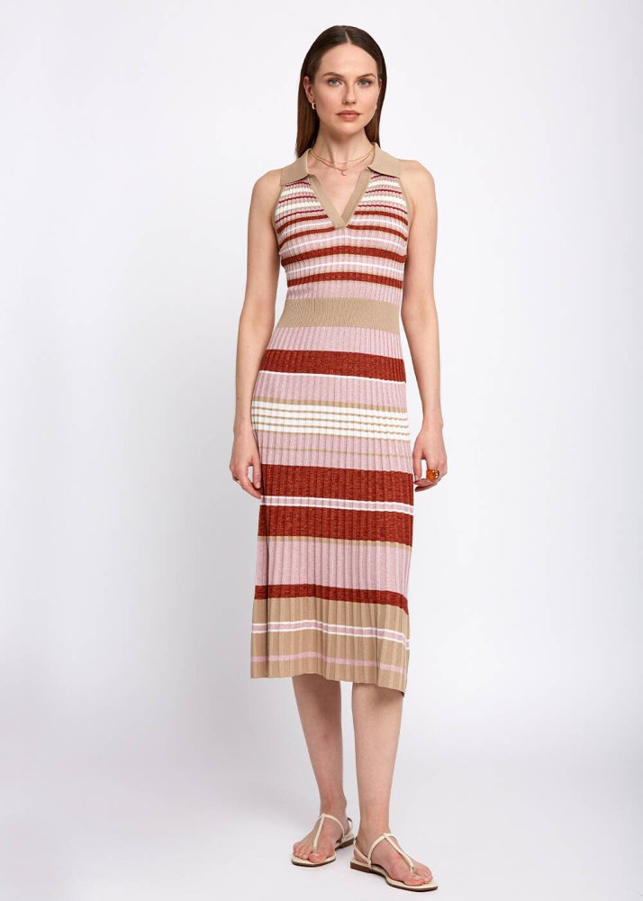 Polo Yaka Çizgili Tarçın Rengi Midi Triko Elbise