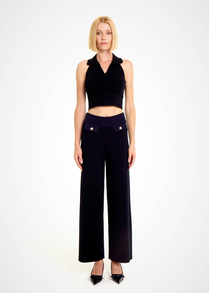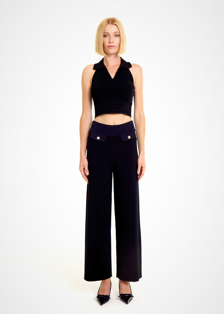 Farklı tarzlardaki giyim stillerine kolaylıkla adapte edilebilen polo yaka siyah crop triko üstü keşfedin. İtalyan ipliklerinden üretilen dar kesim kolsuz v yaka crop triko üst, yaka ve bel detayında bulunan özel örgü tekniği ile hayranlık uyandırır. Özgür ruhlu çağdaş stili ile kadın triko kombinlerine taze bir hava katar. Hem spor hem de şık kombinlerle zahmetsizce eşleşen kullanışlı bir parçadır.
