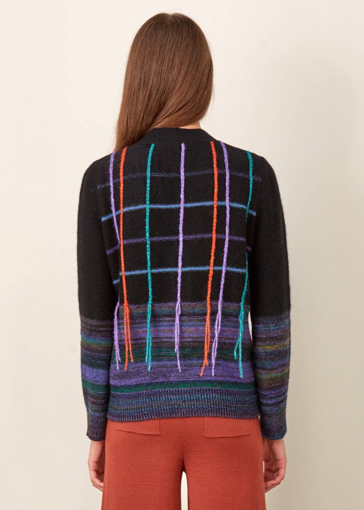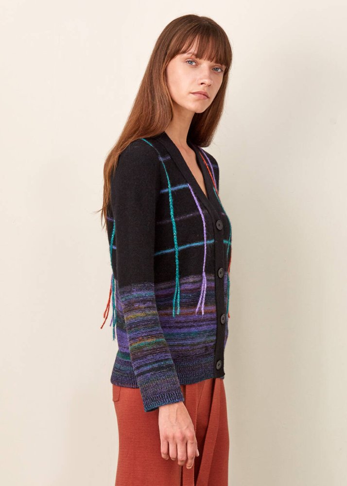 Trikoyu Knitss şıklığı ile buluşturan siyah triko hırka, modern ve çevreye duyarlı kadınlar için üretilmiştir. Global Recycled Standard sertifikalı geri dönüştürülmüş elyaflar içermektedir. Püskül detaya sahip yün hırkanın, renk ve desen oyunları bulunmaktadır. Koleksiyonun Mix&Match özelliği ile diğer parçalar ile kolay kombinleyebilirsiniz.