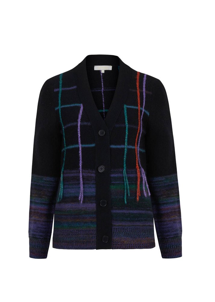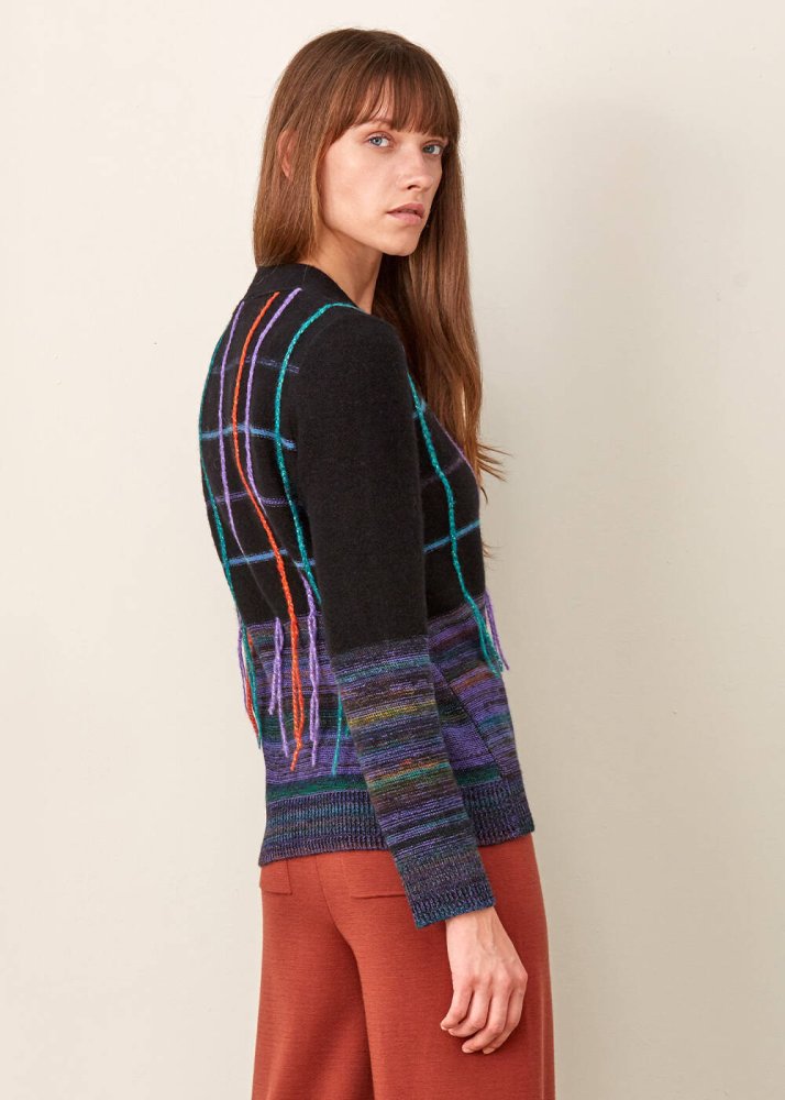 Püskül Detaylı Desenli Siyah Yün Triko Hırka