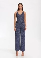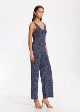 Trikoyu Knitss şıklığı ile buluşturan lacivert triko pantolon, geri dönüştürülmüş ve sürdürülebilir yöntemlerle üretilen İtalyan ipliklerinden örülmüştür. Belden lastik detayına sahip triko pantolon, ışıltılı iplikleri sayesinde hafta içi ve hafta sonu stilinize şıklık katar.