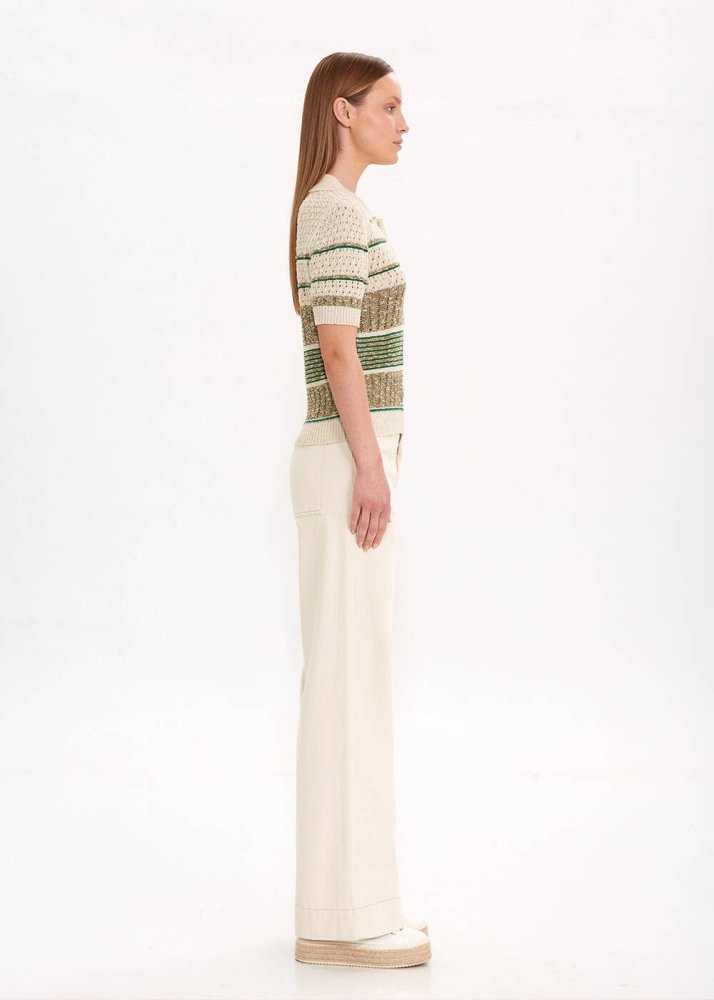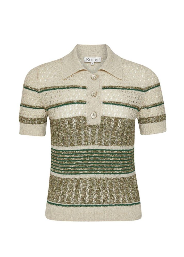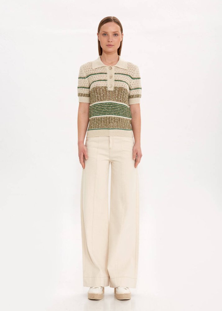 Triko örgü zenginliğini tek parçada sunan yeşil-bej renk bloklu yarım kollu polo yaka üst, Knitss zarafetini yazlık kadın kombinlerine taşır. Sertifikalı doğal ipliklerden üretilen polo yaka düğmeli yazlık triko, ince dokusu ve rahat kalıbı ile konforu ön planda tutan şıklık sunar. Ofis ve günlük kombinlere zahmetsizce uyum sağlar.