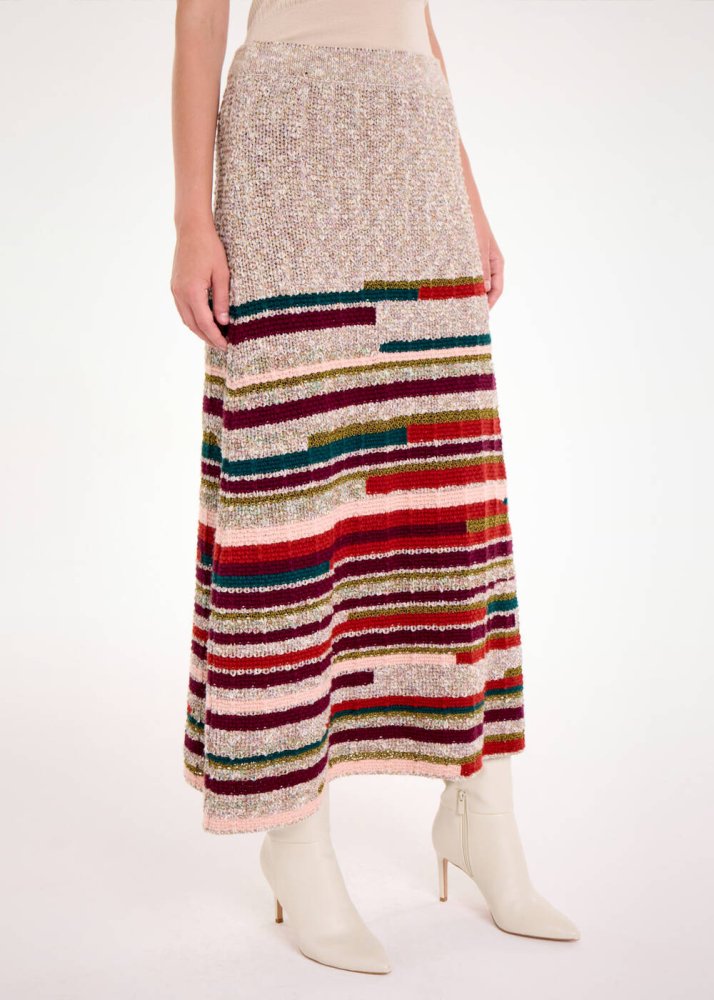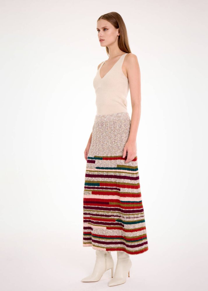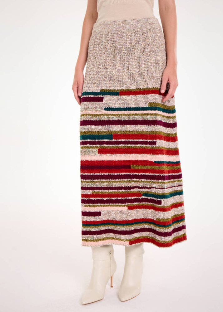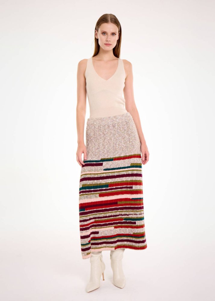 Geri dönüştürülmüş İtalyan ipliklerinden üretilen renk bloklu midi boy triko etek, özgün ve çarpıcı bir stil vadediyor. Geometrik desenlerin cesur renklerle buluştuğu triko etek, maceraperest ve özgür ruhlu Knitss kadınlarına benzersiz bir giyim deneyimi sunuyor. Özel örgü işçiliği ve çağdaş stili ile triko giyime farklı bir boyut katan renk geçişli etek, elastik beli ve rahat kalıbı ile konforu şıklıkla buluşturuyor.