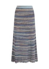 Mavi ve morların uyum içinde bir arada bulunduğu renk geçişli çizgili triko etek, yazlık kadın kombinleri için konforlu ve şık bir parçadır. Pamuk ağırlıklı geri dönüştürülmüş İtalyan ipliklerinden üretilen maxi triko etek, sürdürülebilir giyimi yazlık giyim dolabınıza taşır. Hem topuklularla hem sandaletlerle zahmetsizce eşleşir.