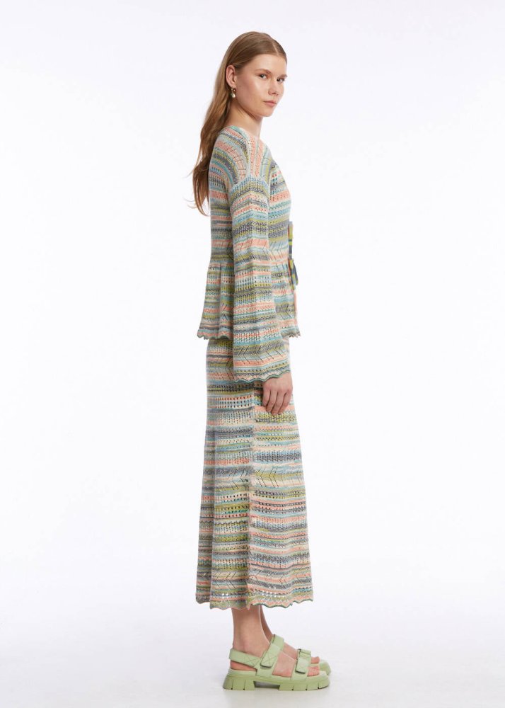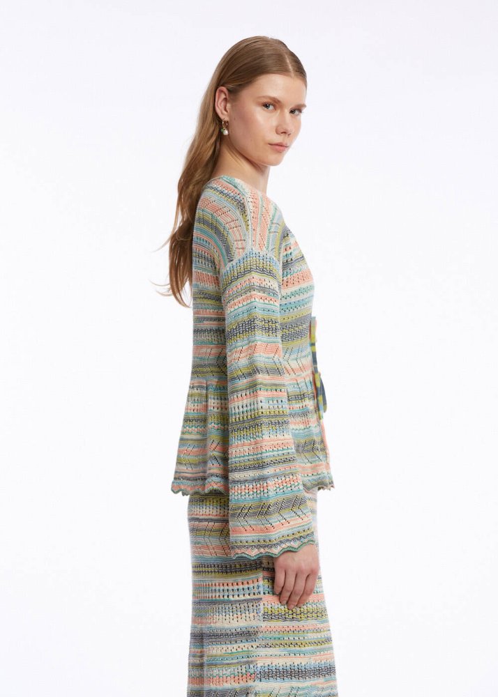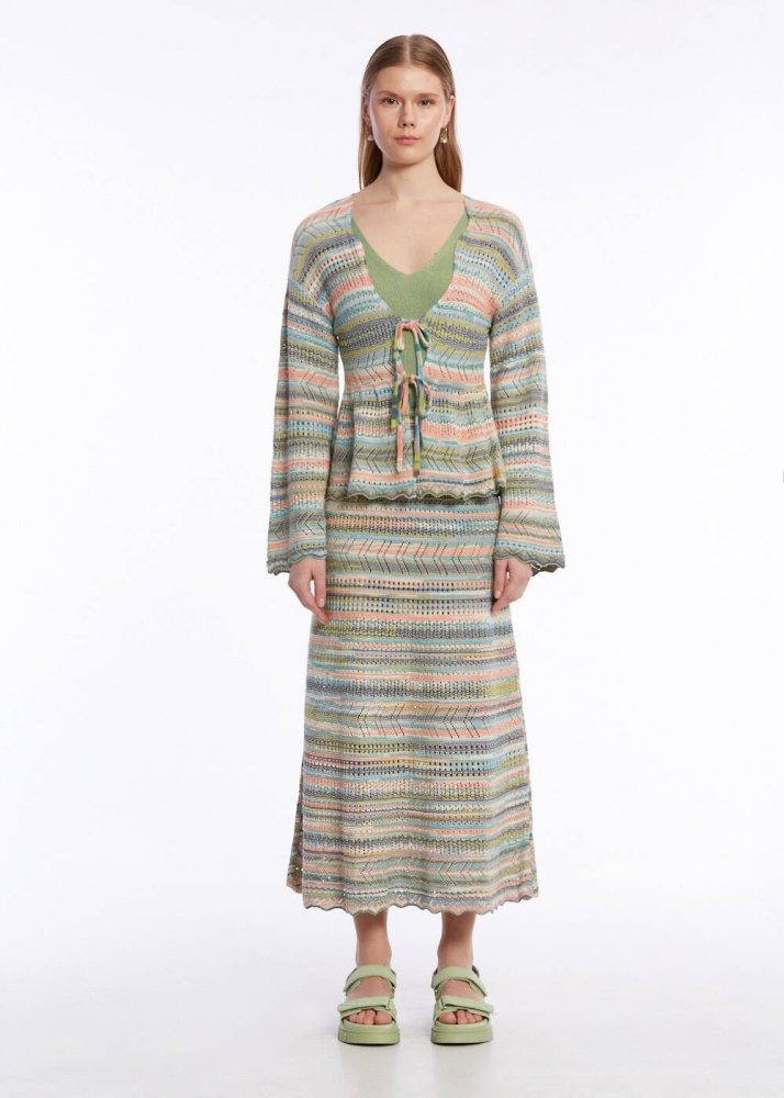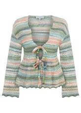Pastel renk geçişleri, volanlı ve bağcıklı modeli, özgün stili ile dikkat çeken triko hırkayı keşfedin. Romantik ve feminen tarzını Knitss’in zarif triko işçiliği ile taçlandıran renk geçişli bağcıklı hırka, pamuk ağırlıklı sürdürülebilir İtalyan iplik içeriği ile doğaya saygılı giyimi yazlık kadın kombinlerine taşır. Takımı olan etekle veya gardırobunuzdaki birçok parça ile zahmetsizce eşleştirebilirsiniz.