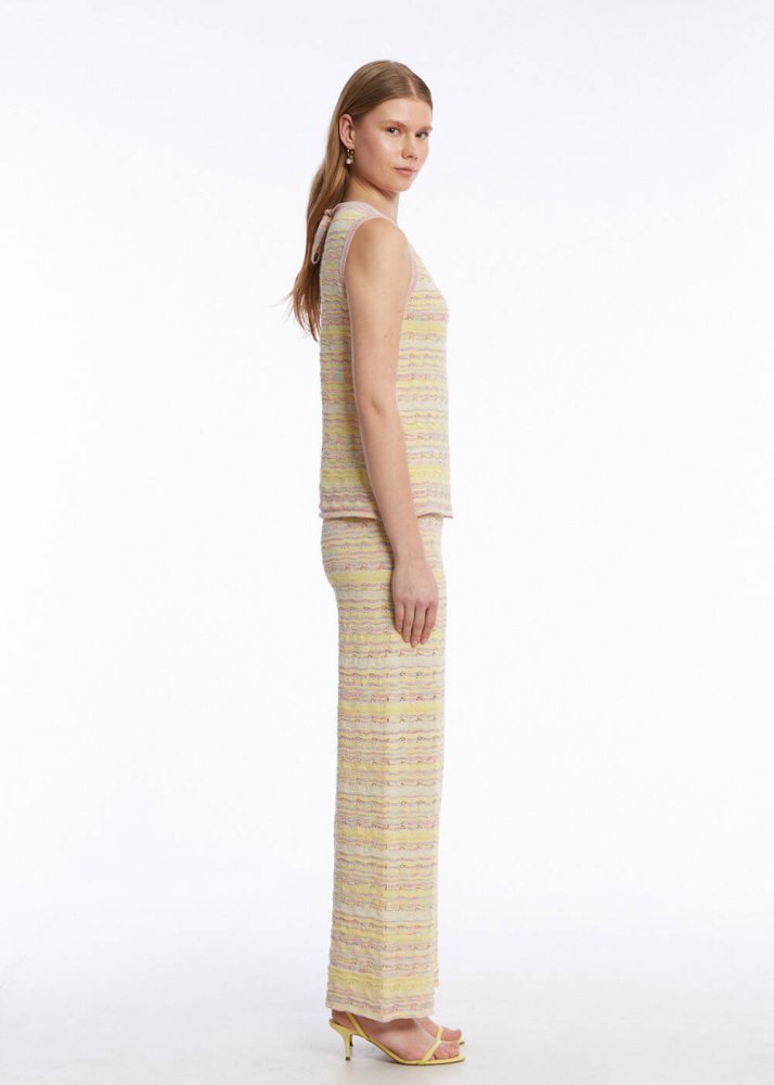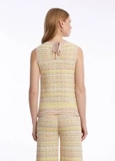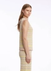 Pastel renkleri ile iç açan bir yazlık stil vadeden renk geçişli kolsuz triko üst, geri dönüştürülmüş sertifikalı İtalyan iplik içeriği ile doğaya saygılı giyimi kadın kombinlerine taşır. Pamuk karışımlı geri dönüştürülmüş ipliklerin hafif ve ince yapısı ile konforlu bir giyim deneyimi vadeden triko üst, zarif işçiliği ile de Knitss ayrıcalığını detaylarda yansıtır.