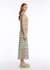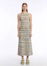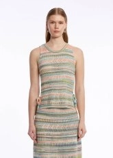 Yazın iç ferahlatan enerjisini pastel renkleri ile kadın kombinlerine taşıyan renk geçişli kolsuz triko üst, pamuk ağırlıklı İtalyan iplik içeriği ile sürdürülebilir giyimin şık bir temsilcisidir. Bağcık detayı, pastel tonlardaki pembe ve yeşil renk geçişli çizgili deseni, zarif triko işçiliği ile yazlık kombinleriniz için konforlu ve şık bir parçadır.