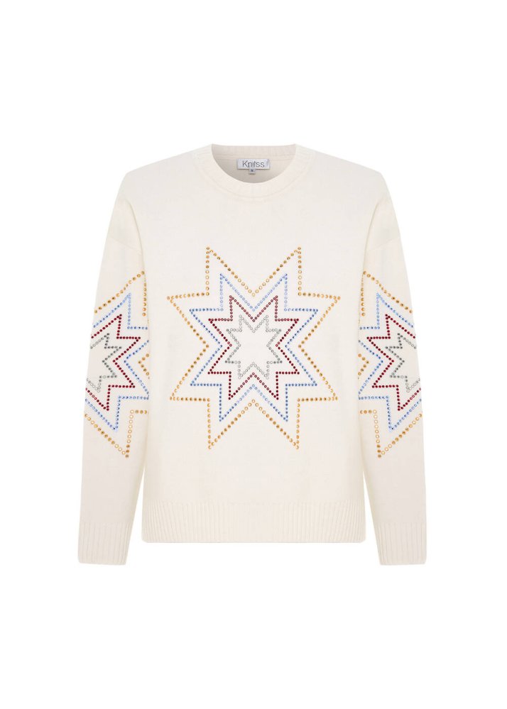 Renkli Yıldız Desenli Merino Yün Triko Ekru