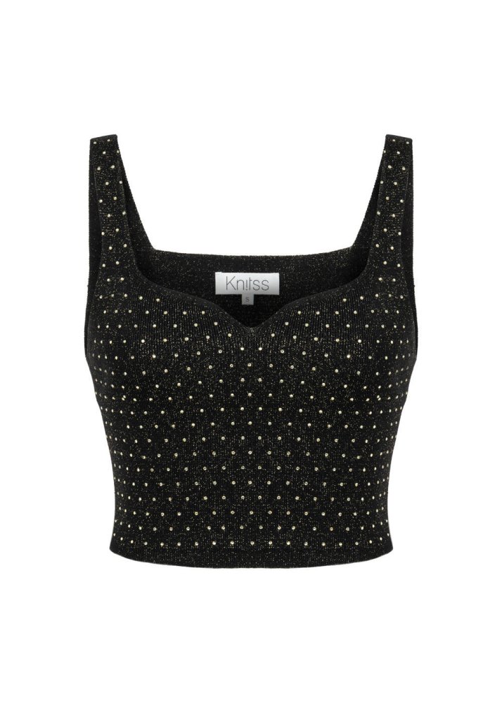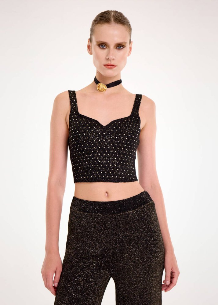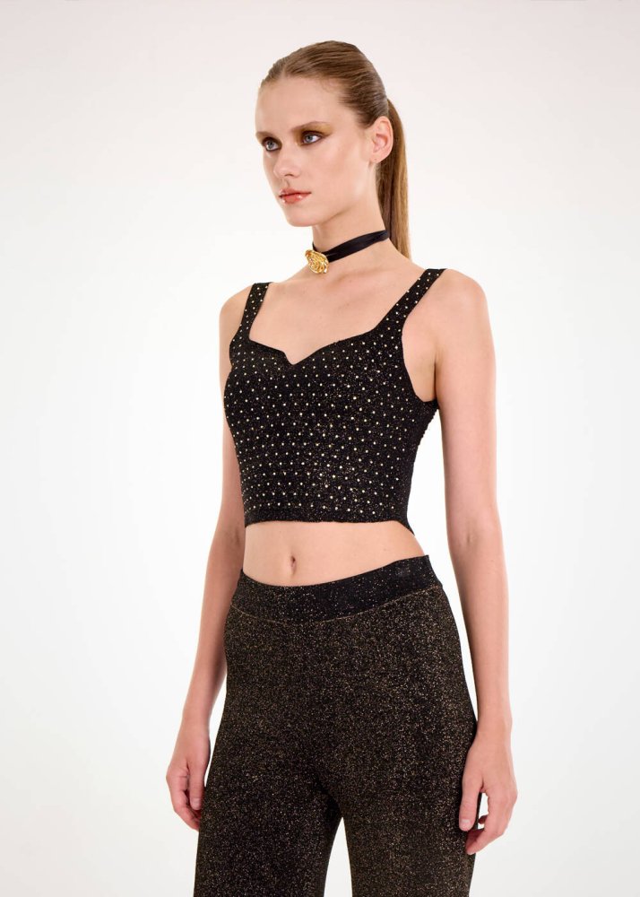 RHINESTONE DECORATED GOLD LUREX KNIT TOP