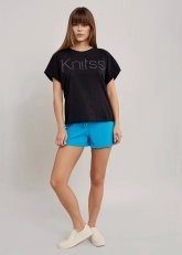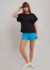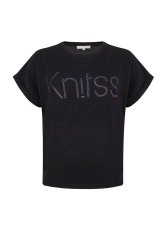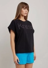 Rhinestone taş logolu %100 pamuk siyah tişört, minimal şıklığı ve maksimum konforu ile yazlık dolabınızın vazgeçilmezlerinden olmaya adaydır. Nefes alan ince saf pamuk kumaşı ve rahat kalıbı ile terletmez, gün boyu konfor sunar. Rhinestone taş Knitss logosu ile çağdaş feminen stildedir. Zahmetsiz şıklık sağlayan zamansız bir tasarımdır.