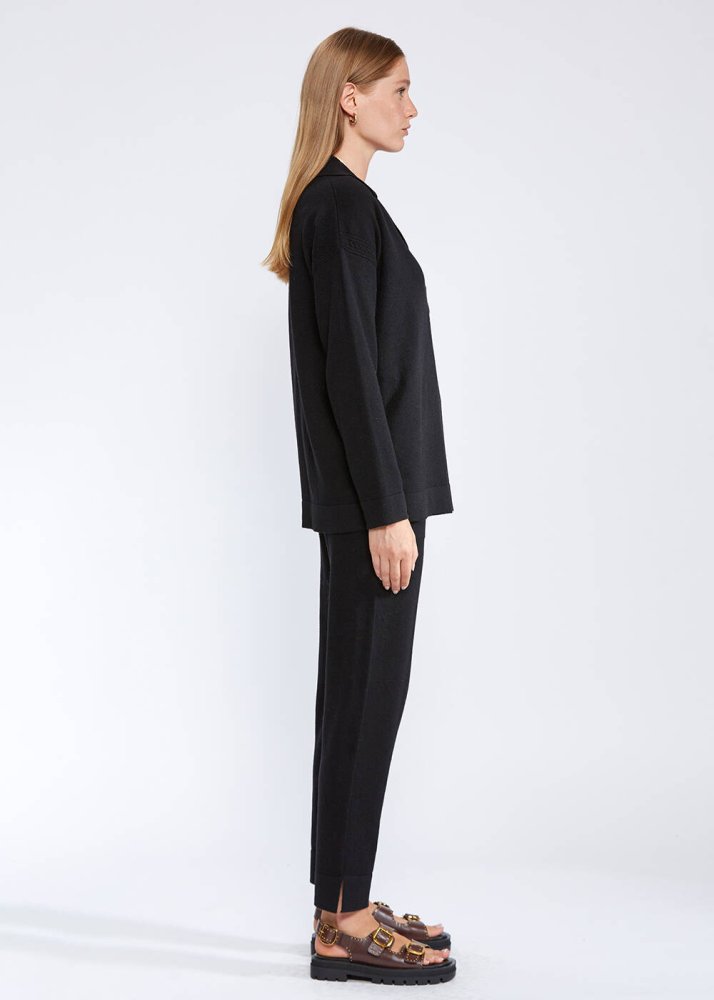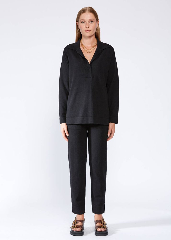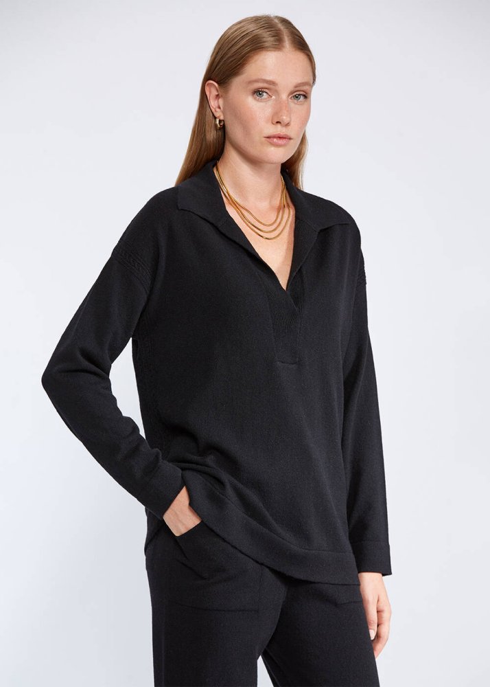Minimal şıklığı ve rahatlığı ile uzun yıllar kışlık dolabınızın en sevilenlerinden olacak siyah polo yaka kazak, kaşmirin benzersiz hissiyatını ilk temastan itibaren yaşatır. Knitss’e özgü zarif saç örgüsü detayı, çağdaş bol kesimi, derin V yaka modeli, geri dönüştürülmüş çevre dostu kaşmirli yün içeriği ile zamansız şıklıkta bir kombin tamamlayıcısıdır.