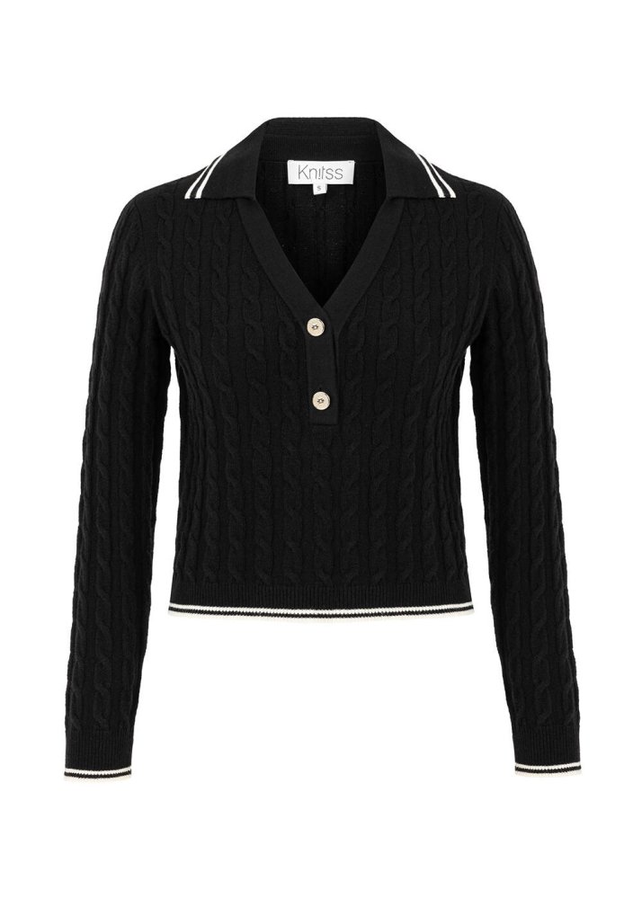 Saç örgü desenli v yaka düğmeli siyah kazak, zarafeti çağdaş stille buluşturan Knitss dokunuşu ile kombinlerinize ayrıcalık katar. Yaka ve kollardaki beyaz biyelerin yarattığı kontrastla trikonun en ikonik desenlerinden saç örgüsünün müthiş uyumuna sahip siyah kazak, sürdürülebilir İtalyan ipliklerinden oluşan içeriği ile de doğaya saygılı giyimin şık ve konforlu bir temsilcisidir.