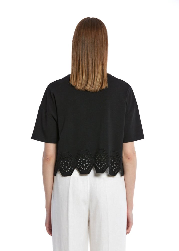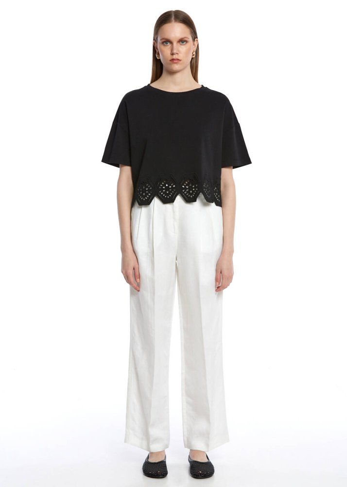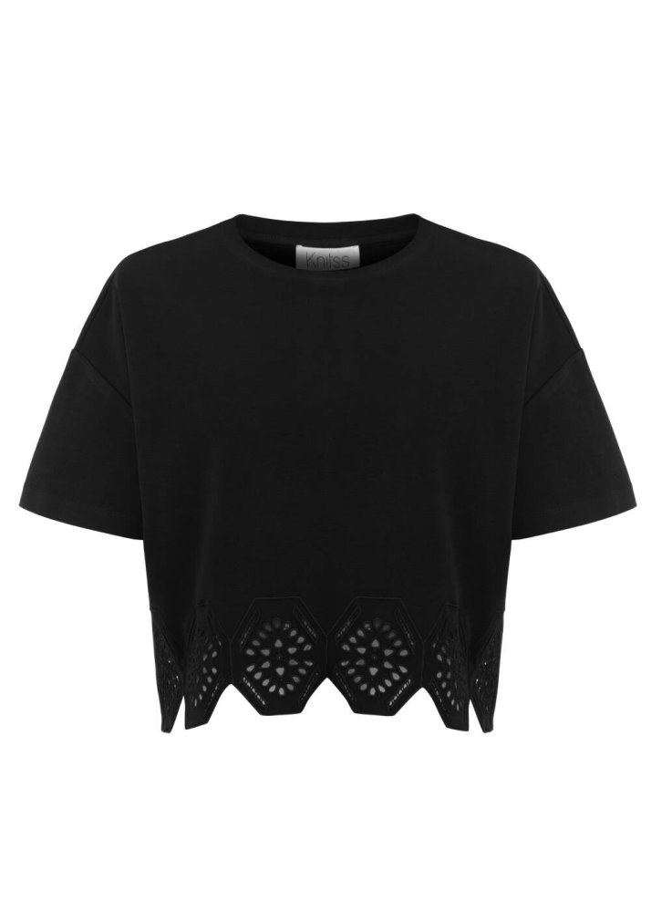 Saf Pamuk Brode Nakışlı Siyah T-Shirt