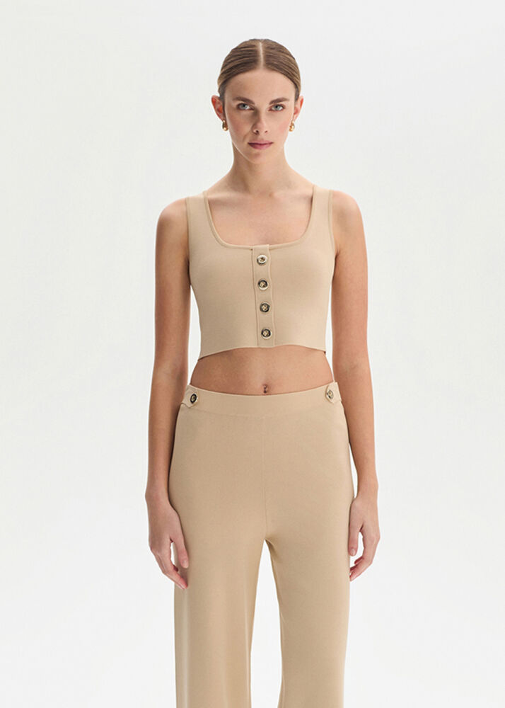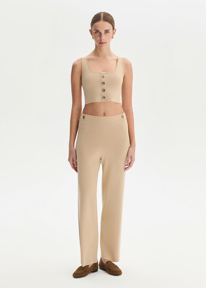Pile Detaylı Triko Pantolon Koyu Kahverengi