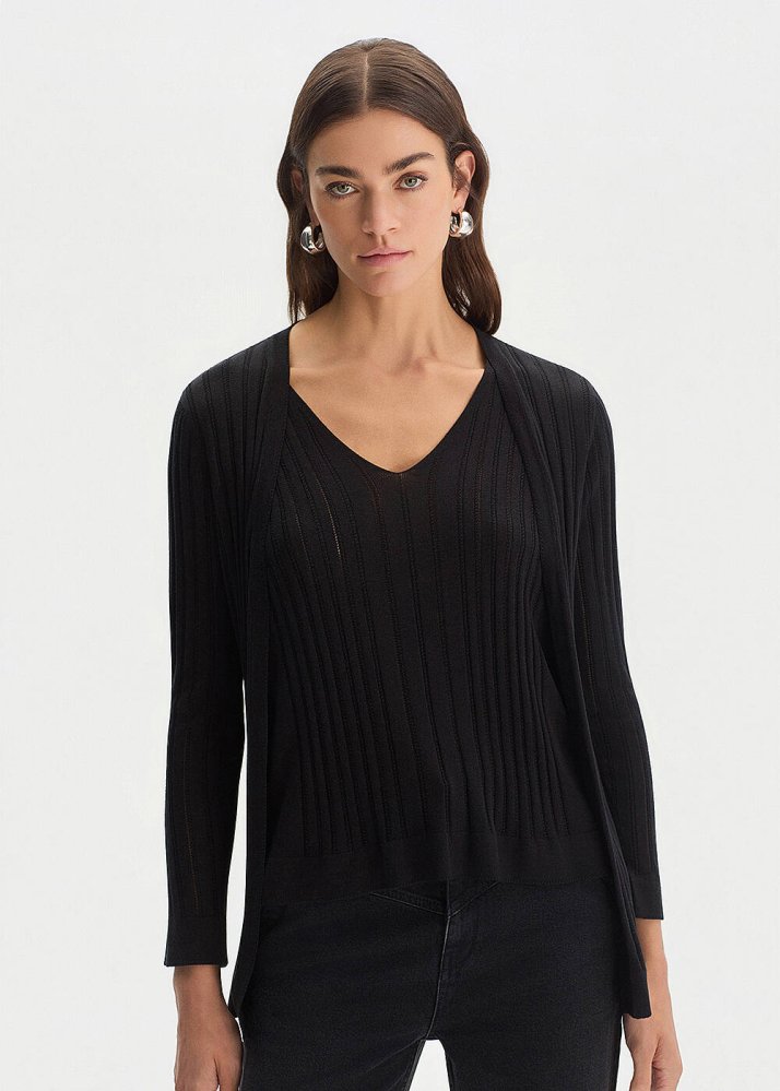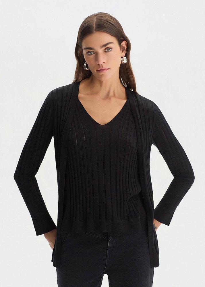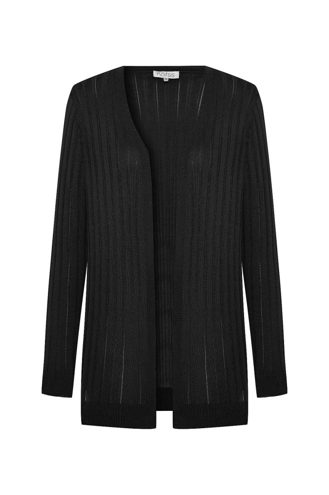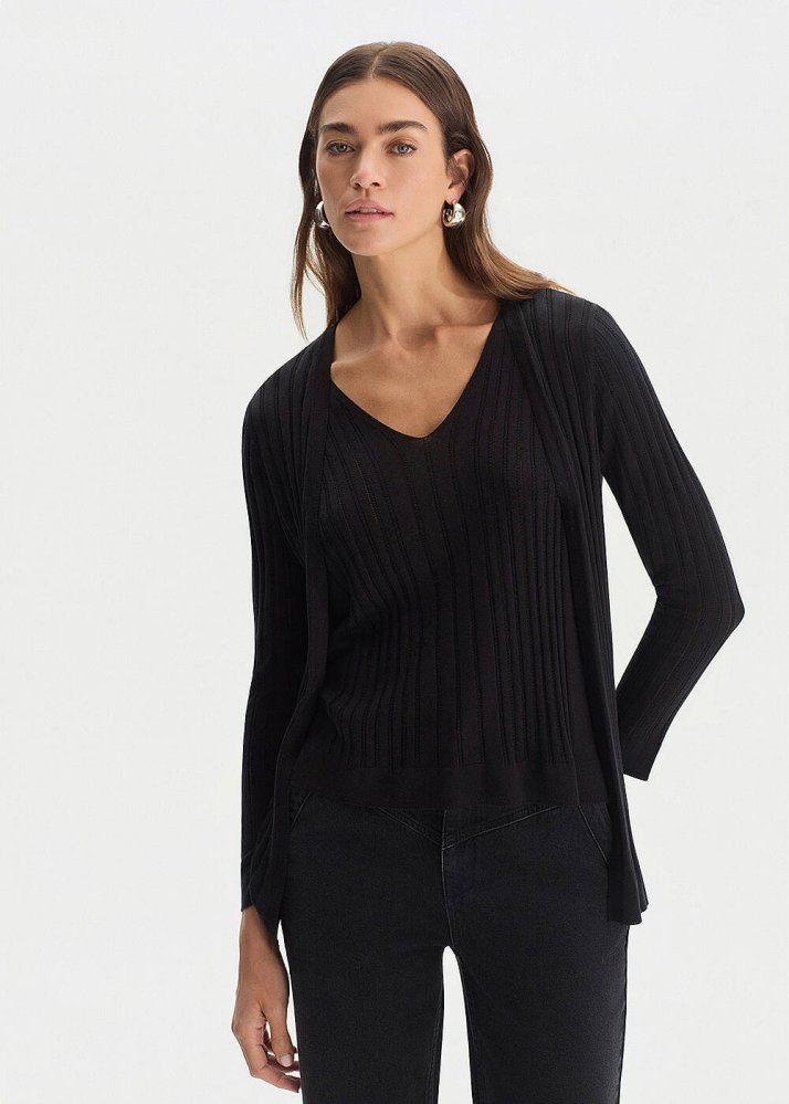 Siyah İpek Karışımlı Triko Hırka, siyahın güçlü ve zamansız karakterini minimal çizgilerle buluşturur. İnce örgü dokusu ve dengeli siluetiyle sofistike bir görünüm sunarken, akışkan yapısı hareket özgürlüğü sağlar. Geri dönüştürülmüş ipek ve cupro karışımıyla, modern ve bilinçli bir stil anlayışını yansıtır.