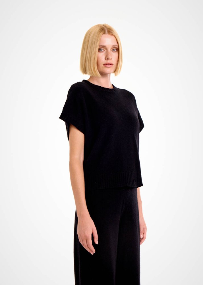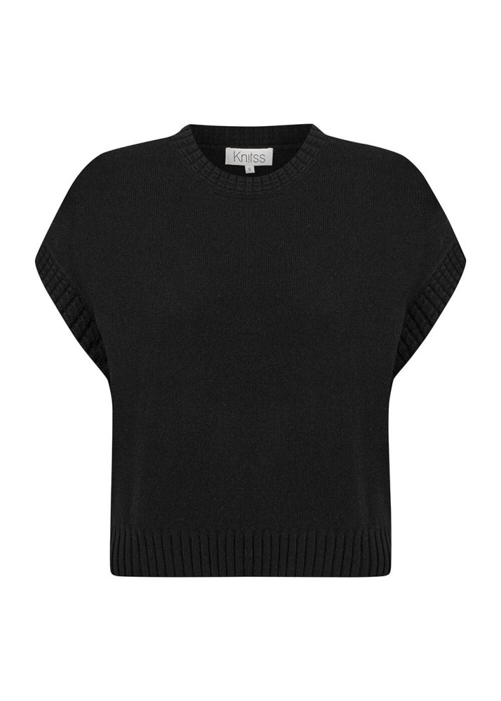 Saf kaliteyi minimal şıklık ve zarif detaylarla buluşturan kolsuz siyah kaşmir üst, seçkin giyim zevkini kombinlerine yansıtan kadınlar için üretildi. Geri dönüştürülmüş kaşmir yünlü içeriği ile saf kalitenin lüksünü her temasta yaşatan siyah triko üst, kolsuz çağdaş modeli ve Knitss’e özgü zarif triko örgü detayları ile ayrıcalıklı bir parçadır.