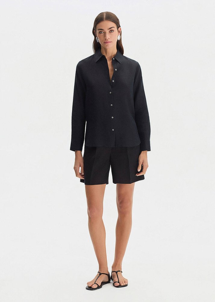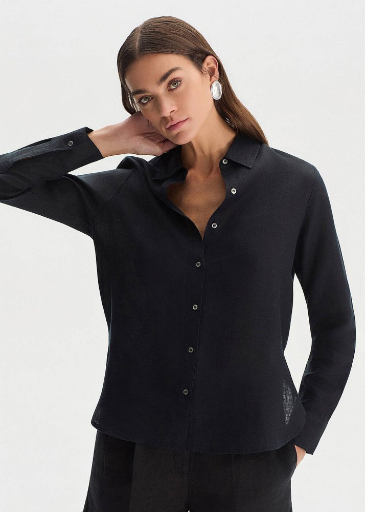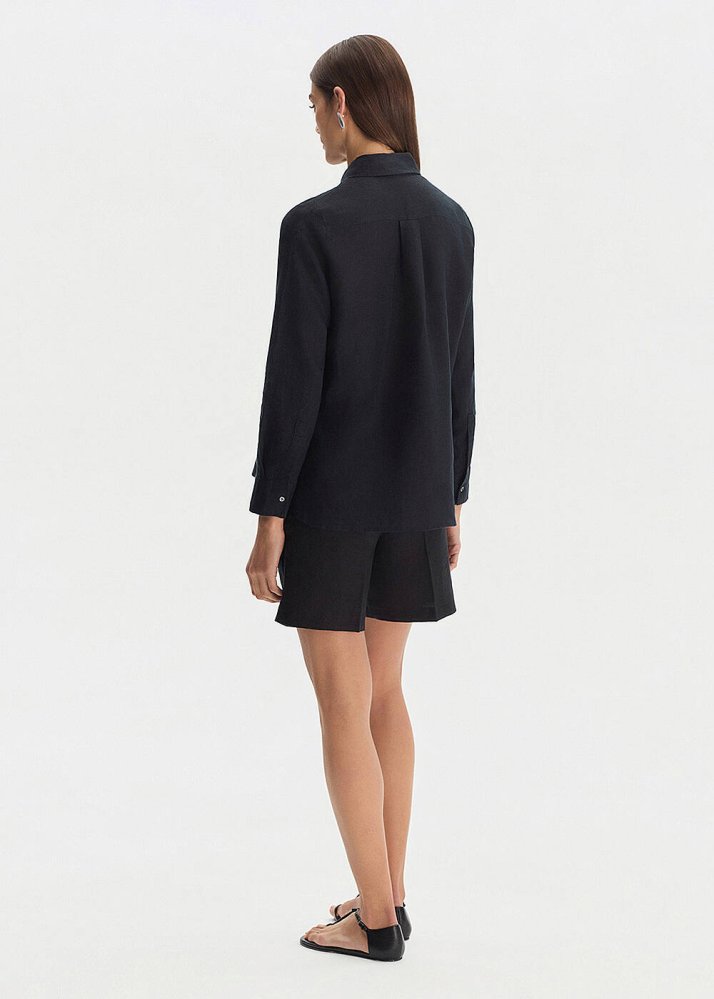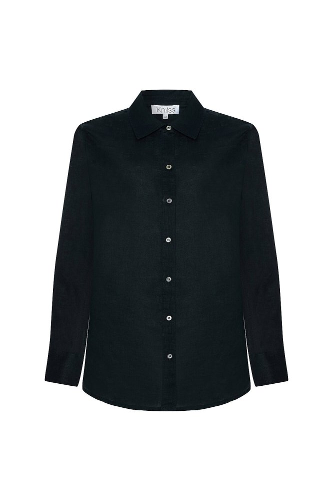 Siyah Regular Fıt Keten Gömlek