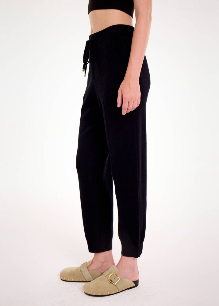 Ev ve spor kombinlerinize triko şıklığını katacak Knitss siyah jogger pantolon; rahat kalıbı, kullanışlı cepleri, elastik bel ve büzgülü kuşak tasarımı ile dolabınızın lokomotif parçalarından olmaya adaydır. Geri dönüştürülmüş İtalyan elyaf karışımlı içeriği ile doğa dostu ve insan teniyle uyumludur. İlk günkü formunu ve rengini koruyan dayanıklı yapısı ile uzun ömürlüdür.