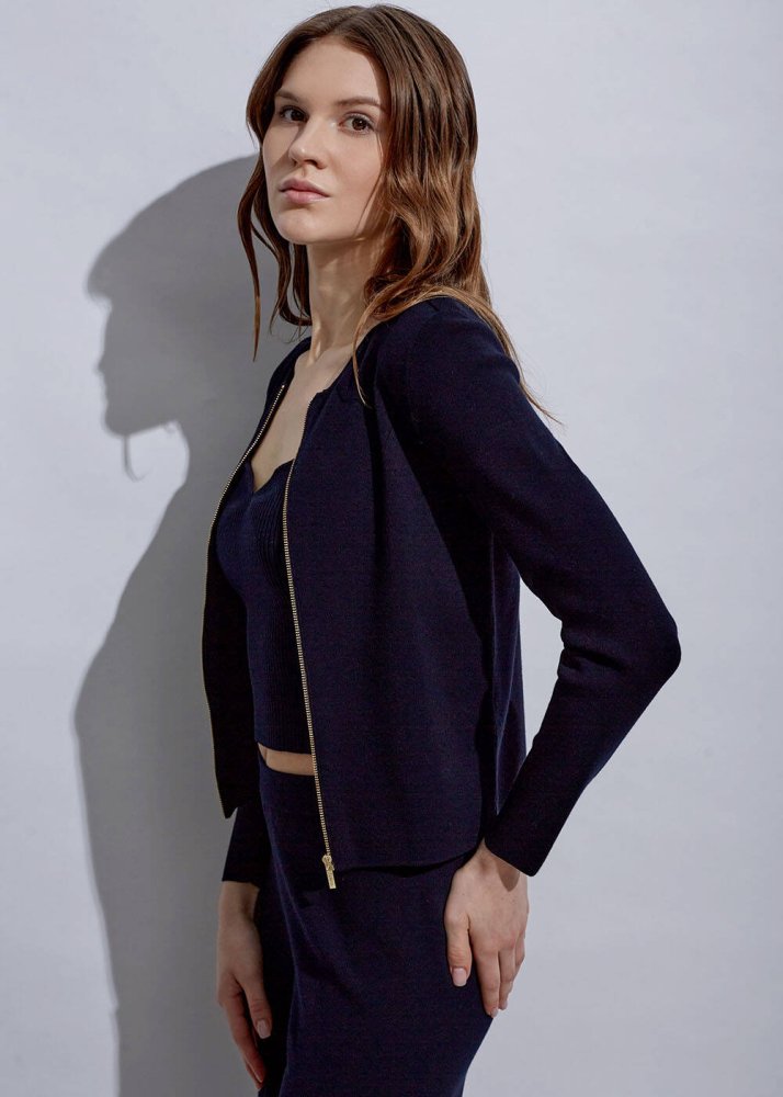 Birinci sınıf İtalyan ipliklerinden sürdürülebilir yöntemlerle üretilen triko hırka ile lacivert rengi ve terletmeyen, nefes alan yapısı ile Knitss ayrıcalığını serin bahar günlerinde kombinlerinize taşıyın. Lacivert triko hırka, slim fit kalıba ve apolet detayıyla smart casual kombinlerinize şıklık ve konforu bir arada sunar.
