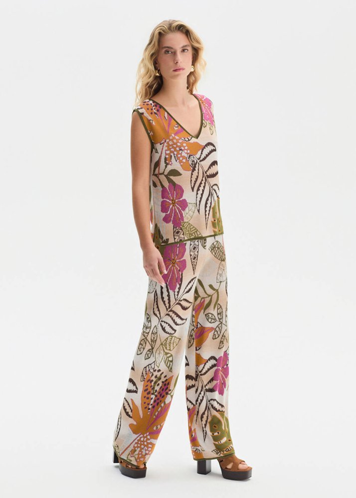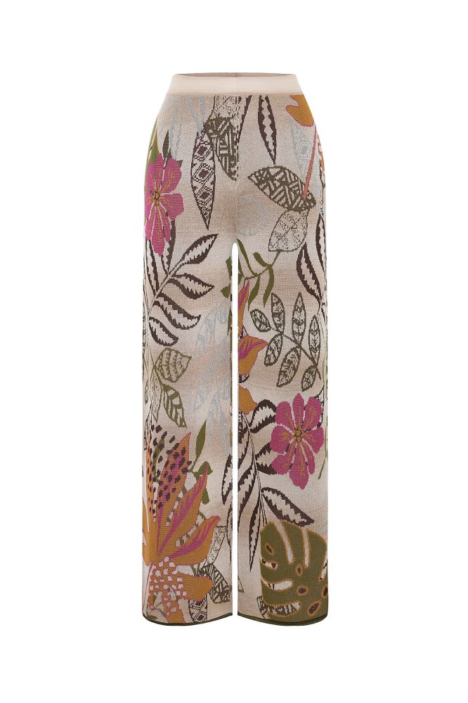 Tropikal Desen Detaylı Triko Pantolon, doğadan ilham alan canlı desenleri akıcı bir formda bir araya getirir. Elastik beli ve hafif yapısıyla gün boyu konfor sunarken, geniş paça kesimiyle rahat ve özgür bir siluet oluşturur. FSC sertifikalı viskon içeriğiyle, doğaya duyarlı bir üretim anlayışını destekler.