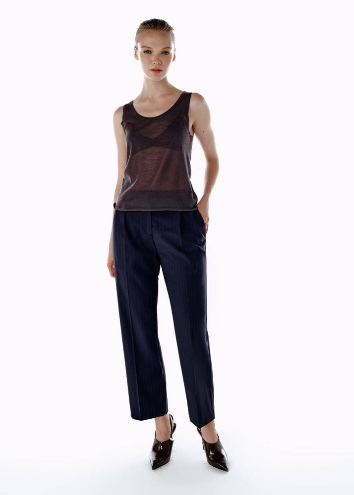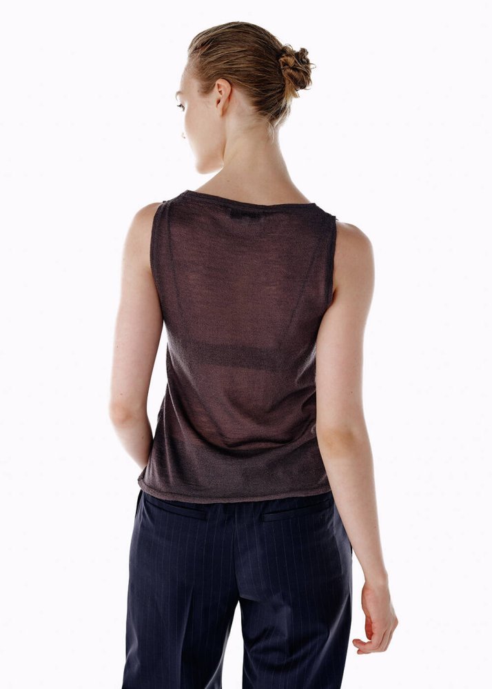 Koyu gri ultrafine merino yün karışımlı triko üst, minimal ama etkili bir stil sunuyor. Kolsuz tasarımı, kombinler için ideal bir temel oluştururken, akışkan formu sayesinde rahatlığı öne çıkarıyor. %88 yün ve %12 poliamid karışımı, hem yumuşak hem de hafif bir his sağlıyor. Gün boyu konforu vadeden tasarım, gardırobun vazgeçilmez parçalarından biri olmaya aday.