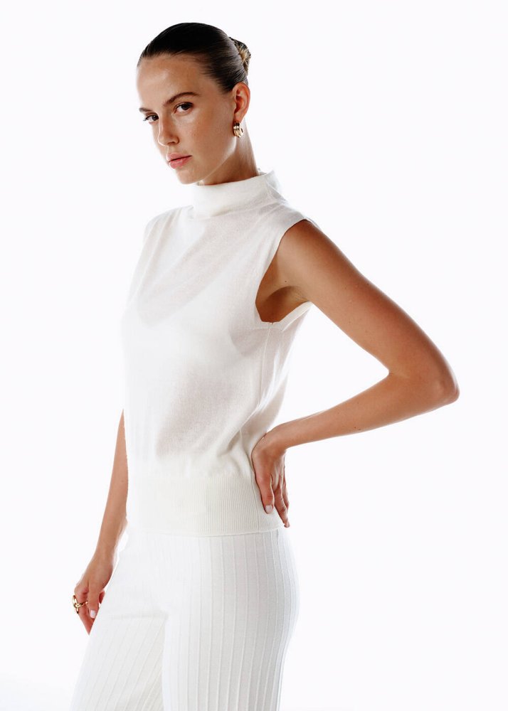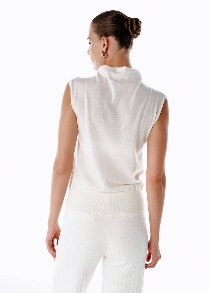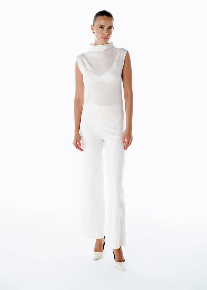 Ultrafıne organik kaşmir ekru triko üst, su gibi akan siluetiyle modern sanatın gardıroptaki yansıması. Kolsuz tasarımı, feminen zarafeti özgür bir dinamizmle birleştirirken, zarif dik yaka detayı modern bir duruş kazandırıyor. Ekru tonun saf ışıltısı, minimal bir tuval gibi farklı kombinlere uyum sağlıyor. Kaşmirin lüks yumuşaklığı ise teninize şiirsel bir dokunuş katıyor.