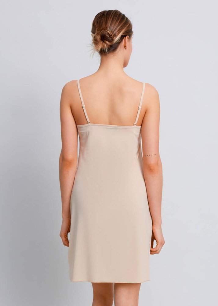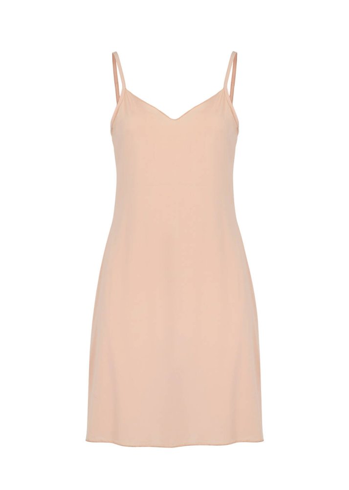 Yazlık kadın giyimin fonksiyonel parçalarından ten rengi askılı uzun kombinezon, rahatına ve özgürlüğüne düşkün Knitss kadınlarının vazgeçilmezi. Askılı elbise astarı; ayarlanabilir ip askıları, mükemmel kalıbı, dekolteye uygun V yakası ve iç göstermeyen ince kumaşı ile Knitss ince triko elbiselerin altına giymeniz için özel olarak üretildi.