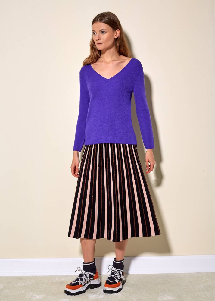 Göz alıcı canlı koyu mavi rengi ile her ortamda dikkatleri üzerinize çekeceğiniz saf kaşmir kazak, cesur Knitss kadınlarının dolabına değer katmak üzere keşfedilmeyi bekliyor. Yumuşacık dokusunu terletmeden ısıtan, dış sıcaklığa göre vücut ısınızı düzenleyen yapısını saf kaşmir lüksüne borçlu olan kazak, rahat kalıbı ve iddialı koyu mavi rengi ile ayrıcalıklı bir trikodur.
