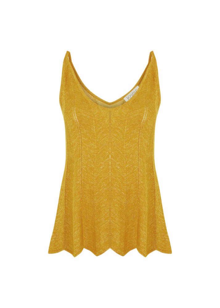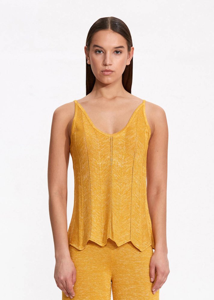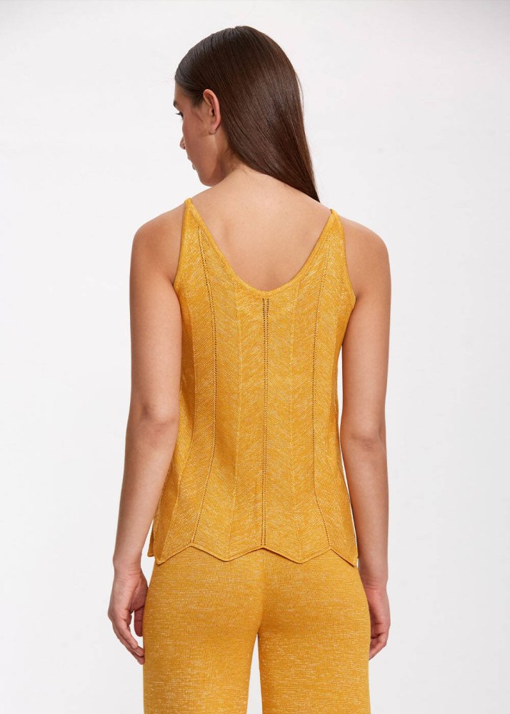 Yazlık gardırobunuzun parçalarından biri olmaya aday sarı triko üst, ışıltılı iplik detayı ve a kesim formu ile şık ve konforu bir arada sunar. Kadın kolsuz triko üst, geri dönüştürülmüş viskon ipliklerden üretilmiştir. Saç örgü detayına sahip v yaka triko üst modeli, takımı olan pantolon ve hırkayla giyerek ton sür ton kombin yaratabileceğiniz gibi koleksiyonda yer alan diğer parçalarla rahatlıkla kombinleyebilirsiniz.