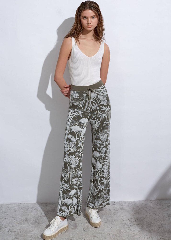 Paradise Pants Tropikal Desenli Ekru Haki Triko Pantolon