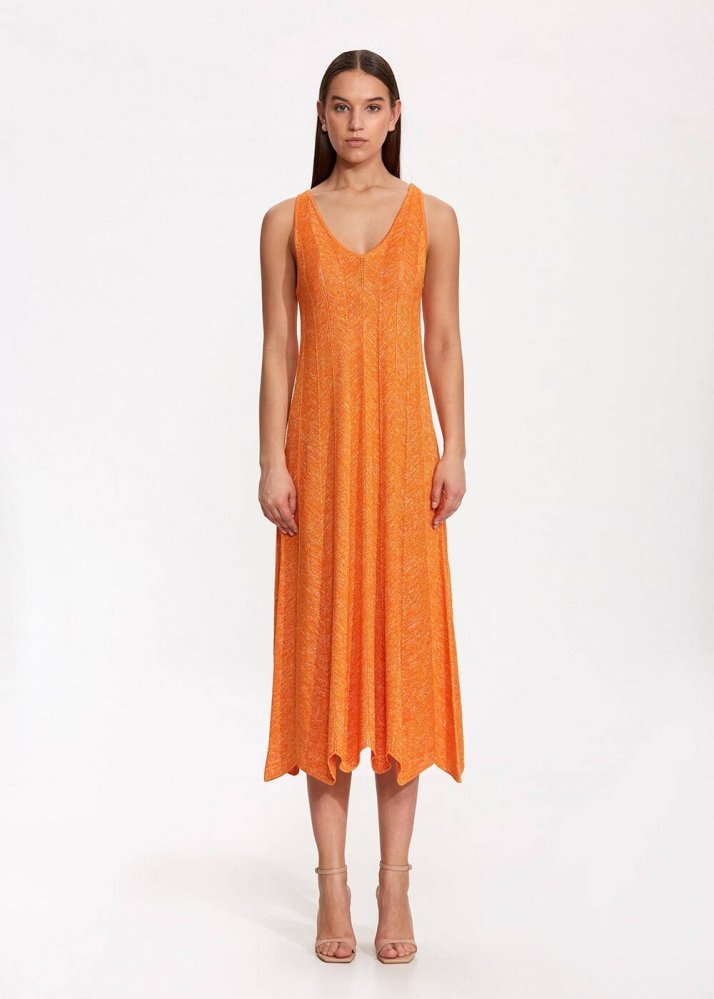 Yaz kombinlerinize renk katacak turuncu triko elbise, ışıltılı iplik ve örgü detayı ile Knitss ayrıcalığını stilinize katın. Uzun triko elbise modeli, geri dönüştürülmüş viskon ipliklerden çevreye duyarlı Knitss kadınlarına özel üretilmiştir. A kesim bir forma sahip Knitss triko elbise, hafta içi ve hafta sonu stiliniz için ideal bir parçadır.