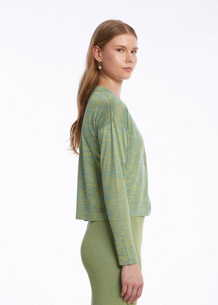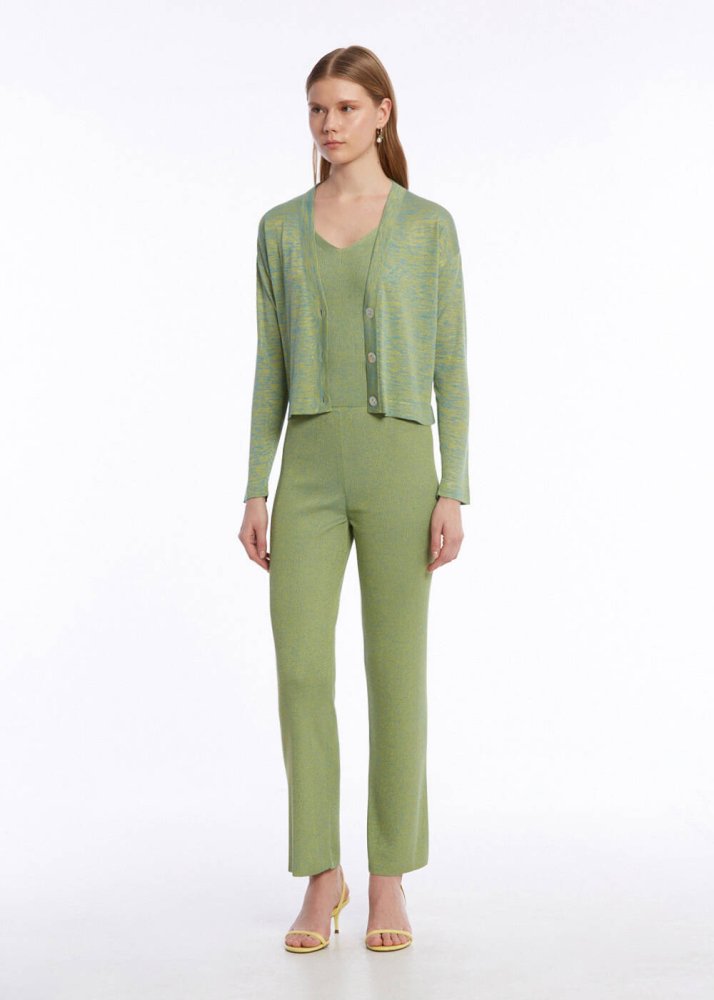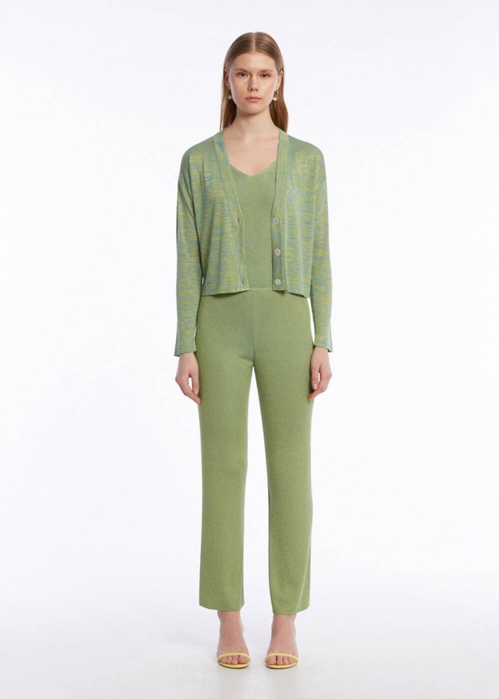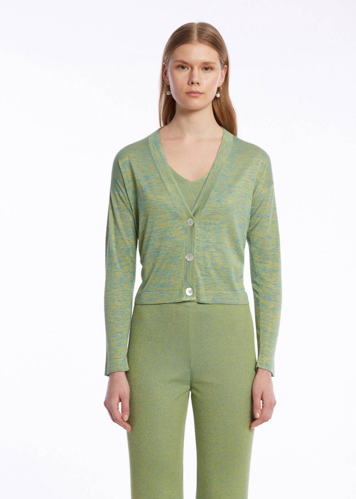 Doğanın renklerinden ilhamla tasarlanan v yaka yeşil hırka, yazlık kadın kombinlerine triko şıklığını taşır. Geri dönüştürülmüş İtalyan ipliklerinden üretilen düğmeli yeşil hırka; canlı rengi, parlak dokusu, ince ve hafif yapısı ile yazlık giyim dolabınızın favori parçalarından olmaya adaydır. Gündüzden geceye kullanım sunan spor-şık kombinlere uygun çağdaş stili ile çok kullanışlıdır.